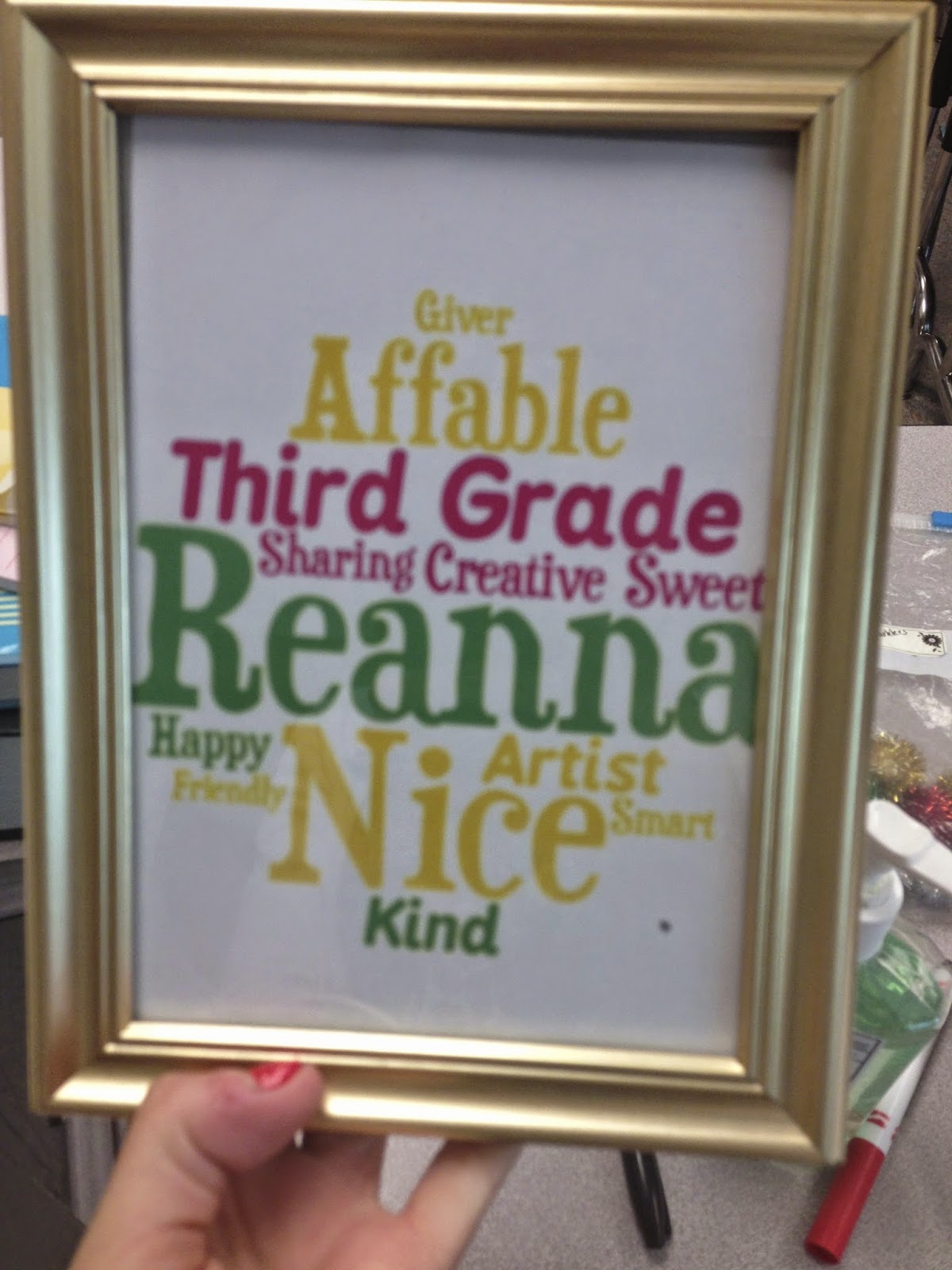 Step 1: Create a handout that has each students’ name on it with a blank space next to it. Give one to each student. Tell students to write down a kind adjective to describe each student in their class. Remind them to be creative and put a lot of thought into each description. Then collect the handouts and take them home to start your creations. My kids get so curious on why we did this activity since I keep the gift a surprise!