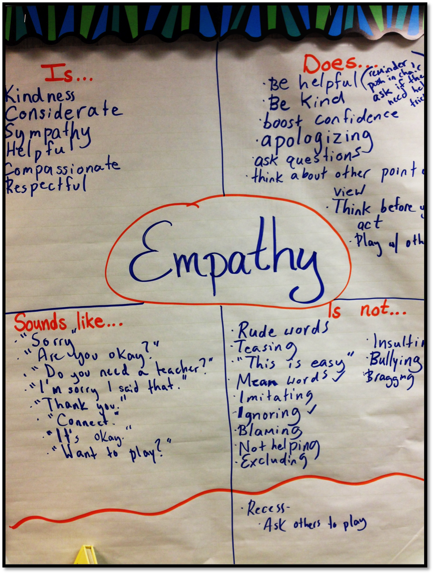 I usually describe empathy as “putting yourself in someone else’s shoes.” This is what makes the most sense to my kids. One of my favorite things a student ever said in my class was towards the end of the year. We had a counselor visit, and the counselor asked the class what empathy is. One little boy raised his hand and proudly stated, “putting yourself in someone else’s shoes… WITHOUT taking your shoes off.” Truer words have never been spoken!