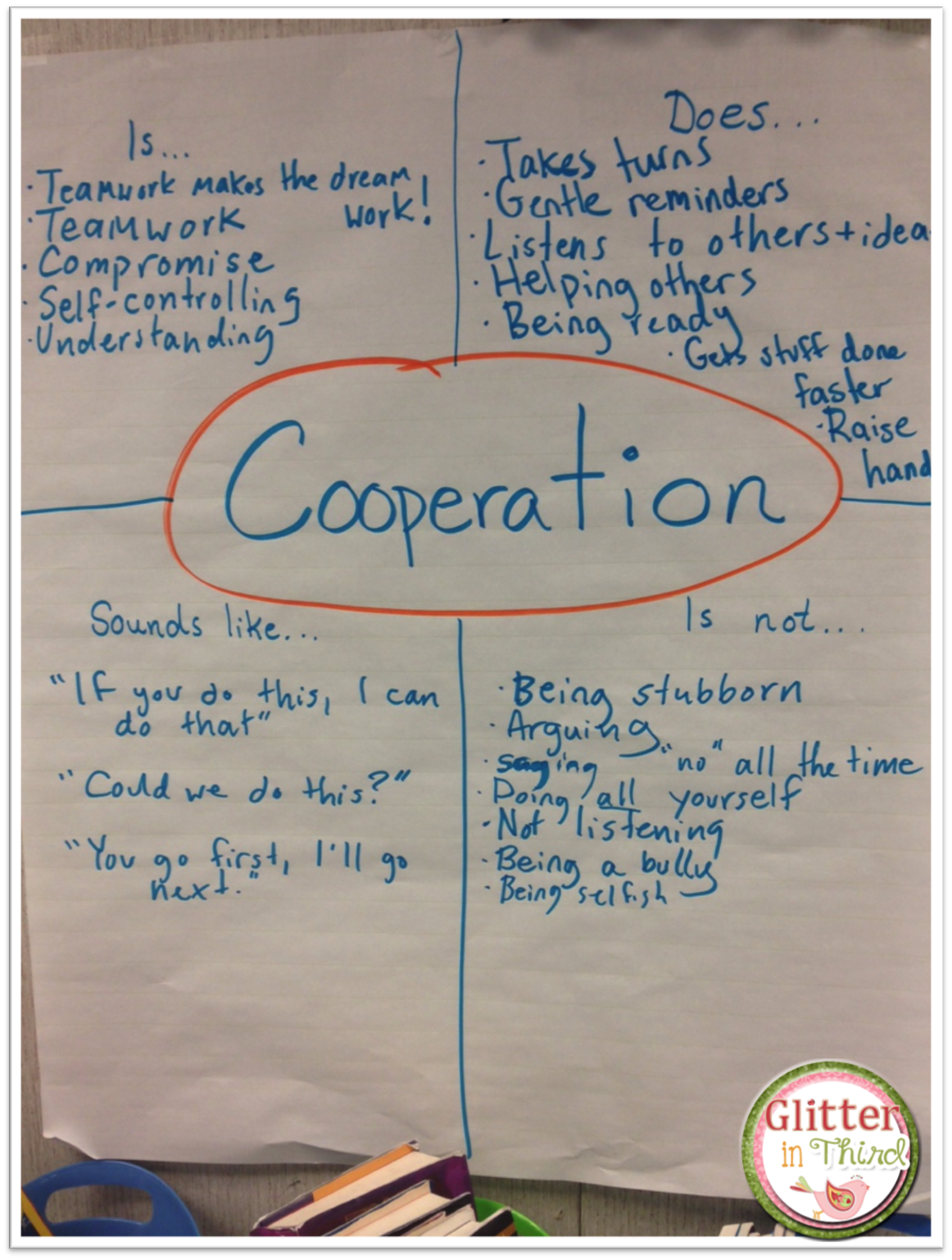 “Swimmy” is my favorite read aloud to talk about cooperation. It is very reminiscent of “just keeping swimming” and the end of Finding Nemo. So cute. The book is all about working together and showing teamwork! Afterward, we talk about the message in the book and create an anchor chart together.
