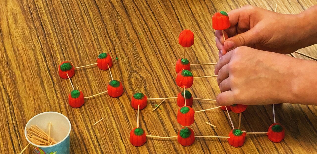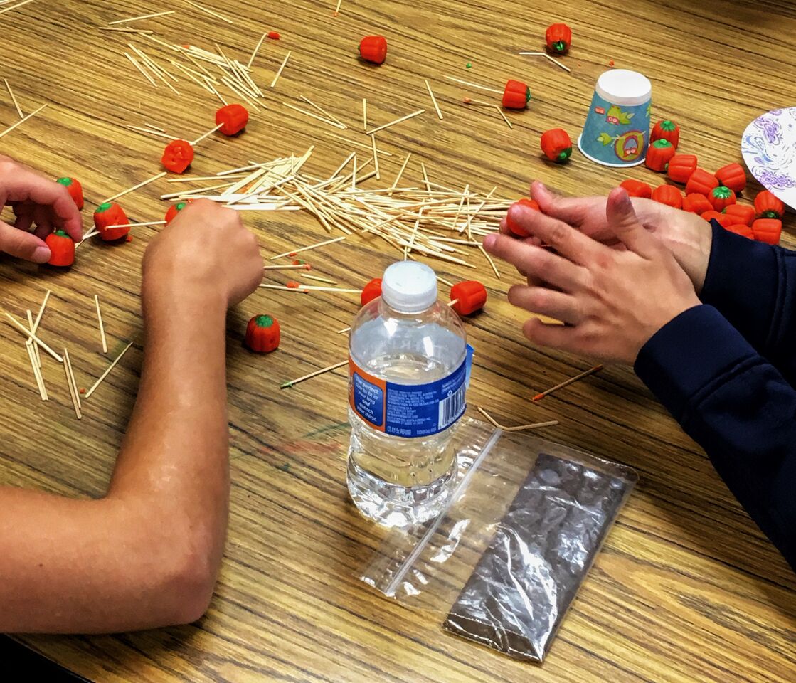 Finally, we do our STEAM activity! For this activity, you need toothpicks and a few bags of Mallo-Creme Pumpkins. The pumpkins and toothpicks serve as the building materials. The mission? I tell the kids that we are creating structures – whoever can create the tallest structure that can withstand a Halloween windstorm is the winner. I give them 15 minutes and they get to work in groups of three. Before they start, we go over the idea of teammate and listening to others… this helps avoid any third-grade frustration or tears!