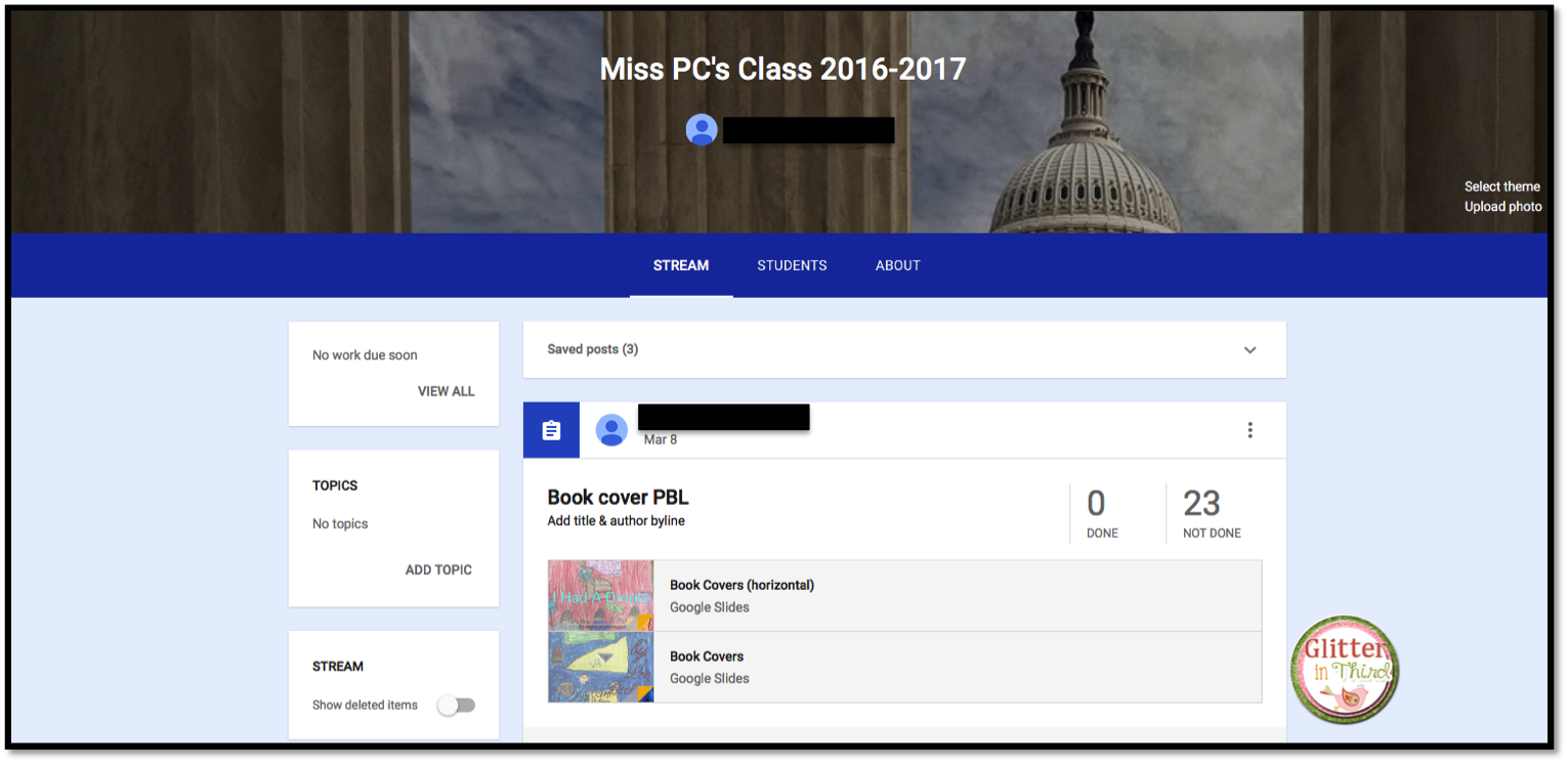 | An example of a Google Classroom main page. All students have access to this main page. |