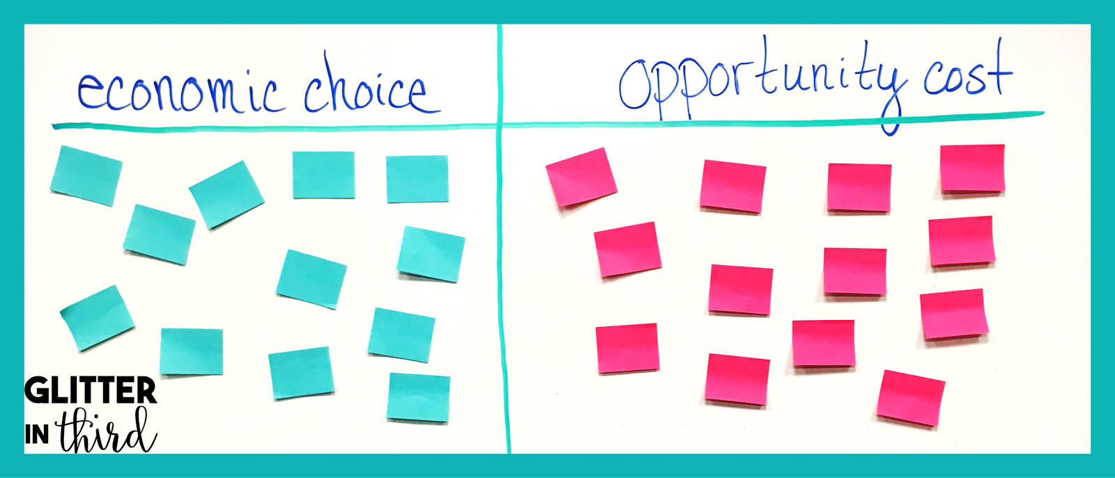 - As an extension activity and to check for understanding, I’d give students a choice of vanilla or chocolate. Then, pass out two Post-It Notes per student. They will identify which one they want by writing one per Post-It, then sticking them up on the board to identify the opportunity cost and economic choice. To make sure they understand the two vocabulary words, I’ll also ask them to put a star next to the one they DO want.