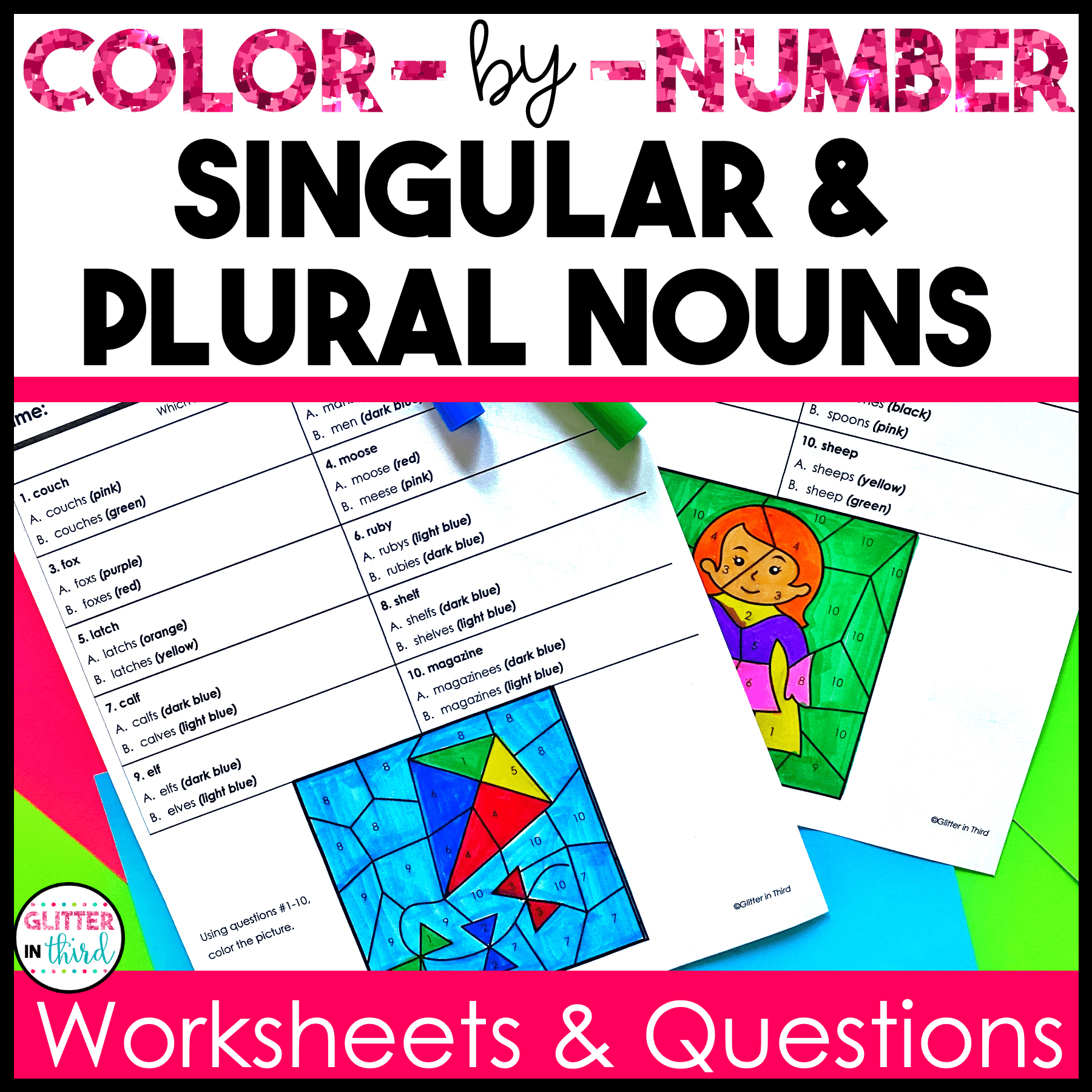 Singular and Plural Nouns Worksheets Color-By-Number Grammar